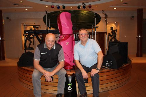 Mark and Neil setting up their equipment on the Cunard Queen Mary 2 ocean liner before departure on its first World Voyage of 2020.